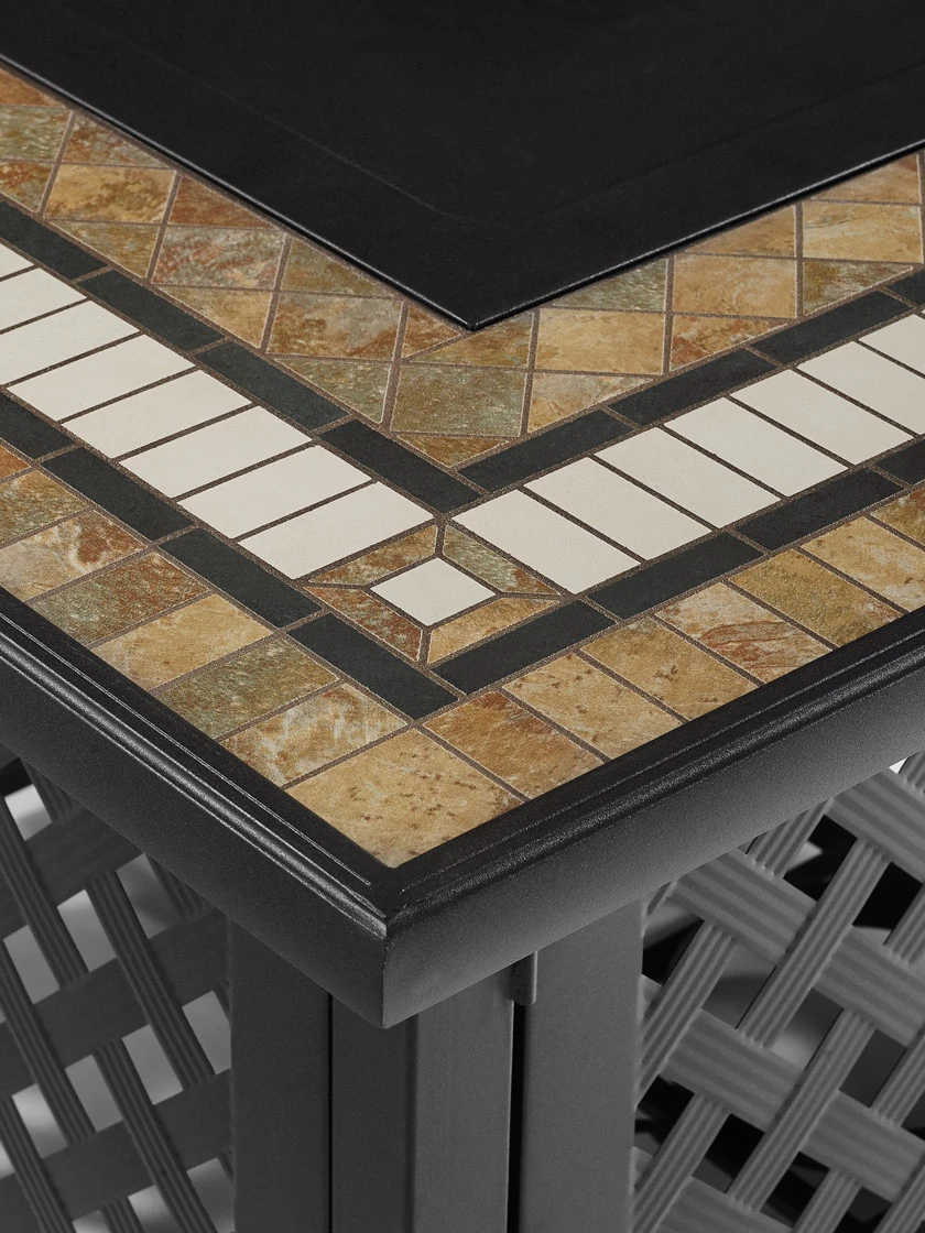 Gather around the Tucson Fire Table for a toasty evening under the stars. Constructed from a sturdy weather-resistant steel frame and a beautifully tiled stone top, this substantial firepit is ready to become the centerpiece for any outdoor seating. The gas controls and a rack for a propane tank are located inside the table’s lattice-style base, keeping them close at hand but out of sight. Stay warm and cozy in the great outdoors with this long-lasting fire pit table.